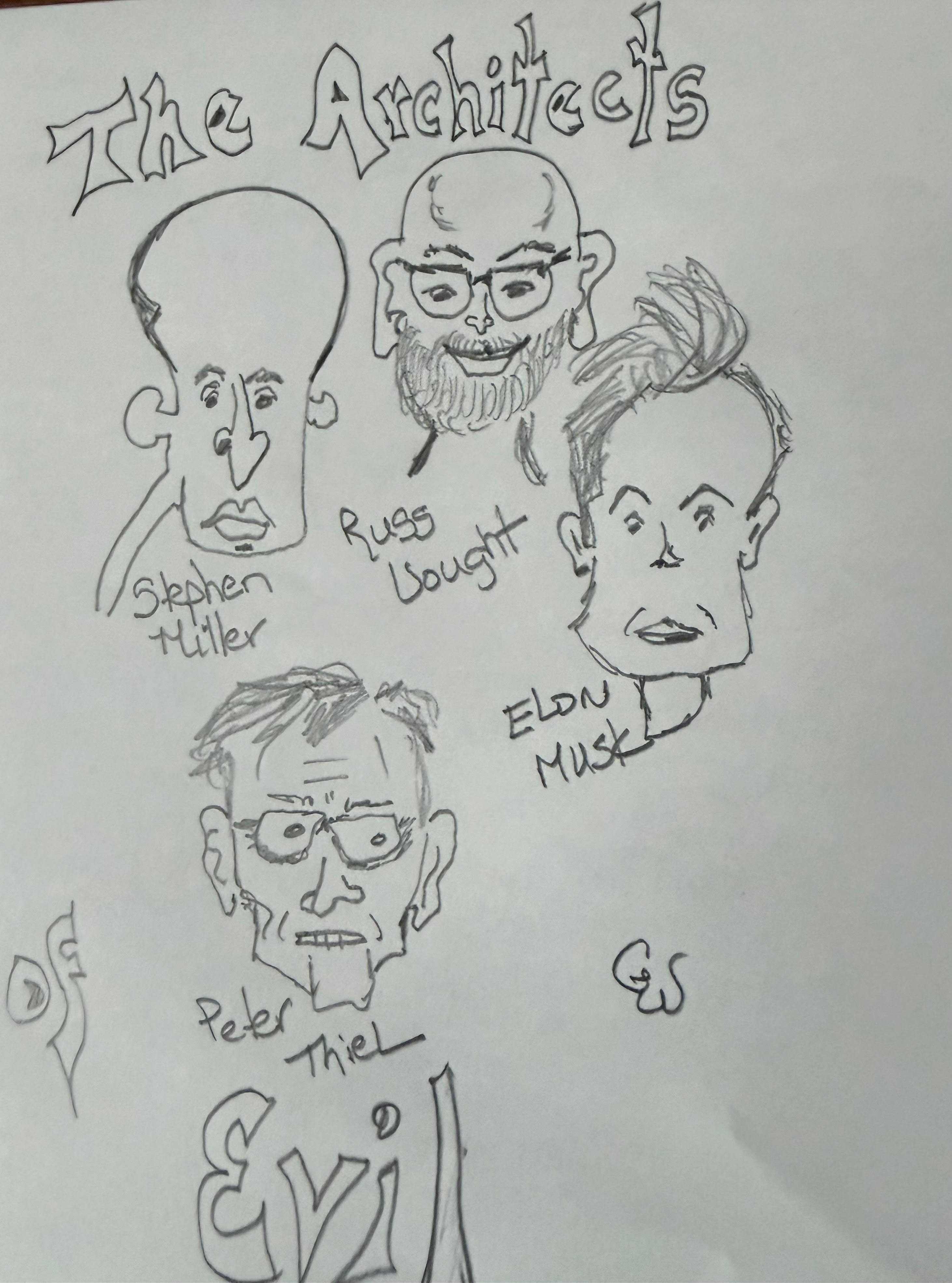 Behind all of this, unelected men are pulling the strings: Peter Thiel, Russell Vought, Stephen Miller, and Elon Musk — the masterminds of Project 2025.